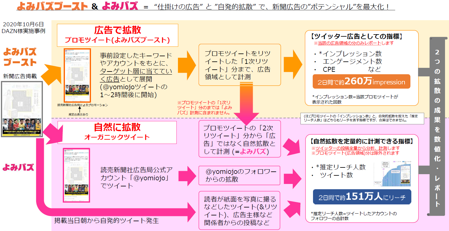 2020年11月、読売新聞社広告局は、新聞広告からのSNS拡散「よみバズ」の知見を生かし、ツイッターでの拡散を能動的に行う新広告商品「よみバズブースト」をローンチしました。